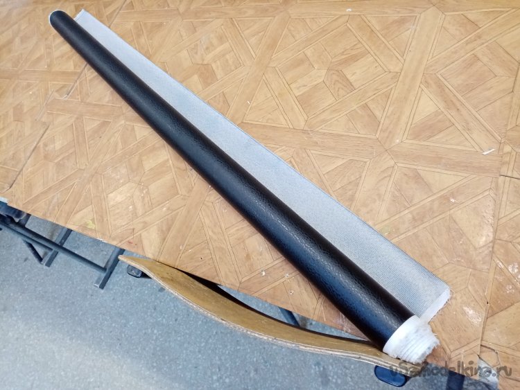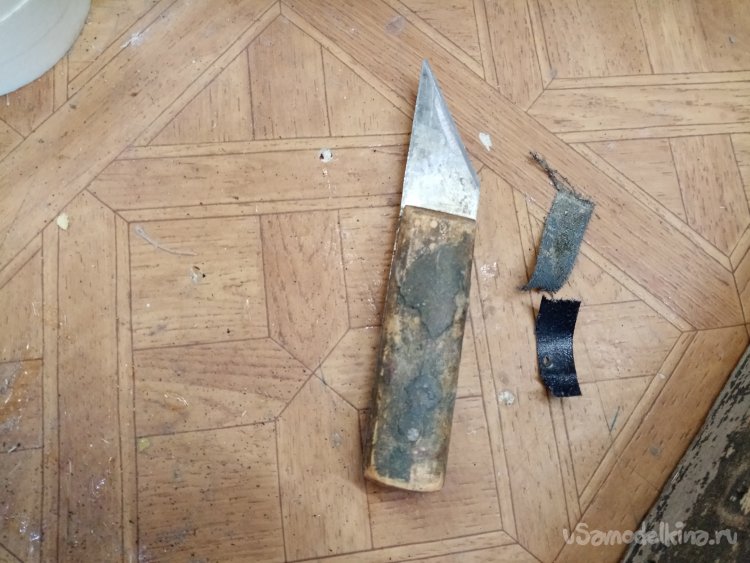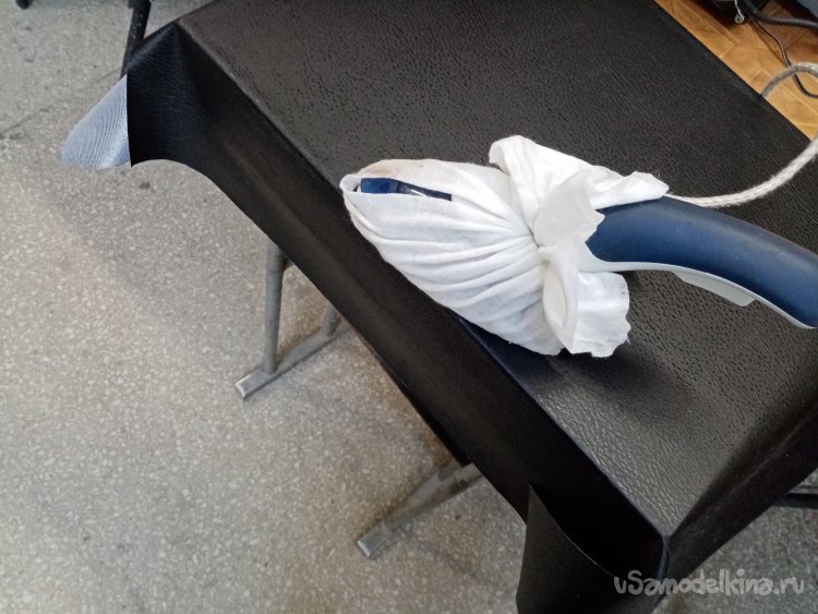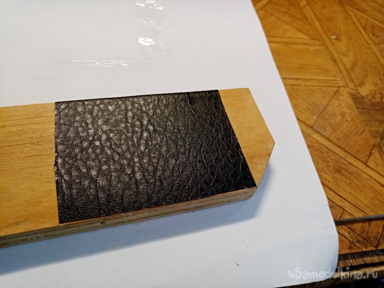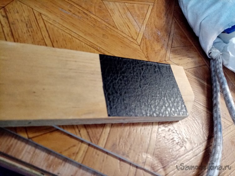 Высохшую заплатку прикладываю к дереву, на который тоже нанесен клей и прогреваю материал утюгом. Подошву обернул косметической салфеткой для предохранения материала. От температуры клей плавится и хорошо приклеивает материал. Метод мне понравился. Не нужно держать обшивку до полного высыхания клея. Просто нагреваю утюгом, все схватывается.
