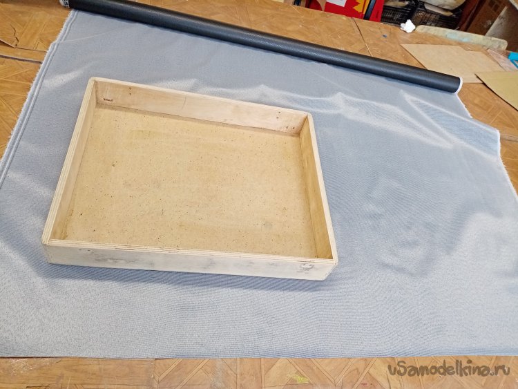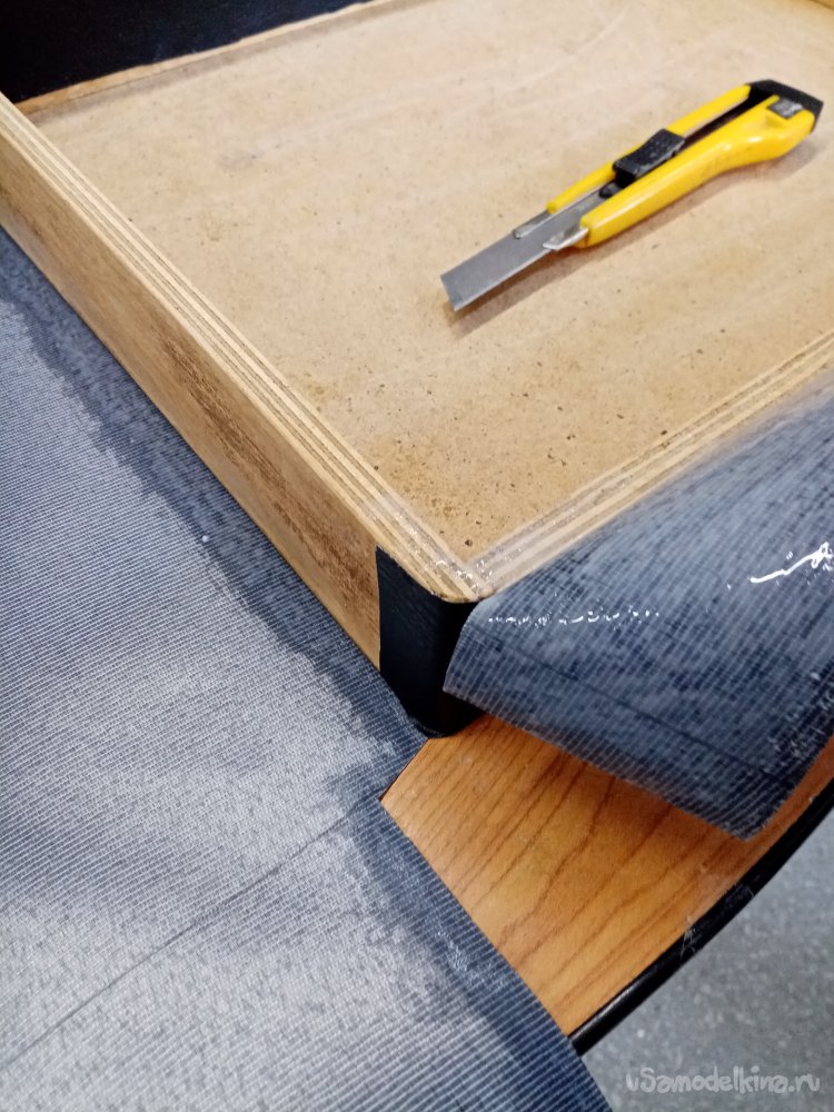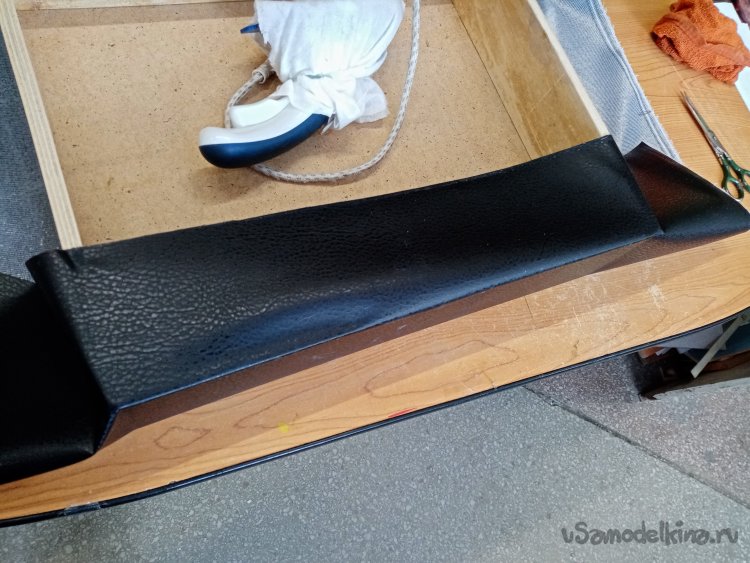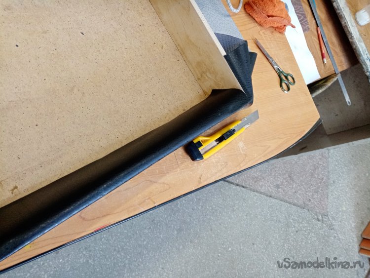 Вторая половина оклеивается по такой же схеме. Сначала приклеиваю материал на внешнюю сторону. Затем разрезаю по бортам и приклеиваю. Не только по бортам, но и на внешнюю сторону.