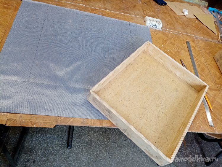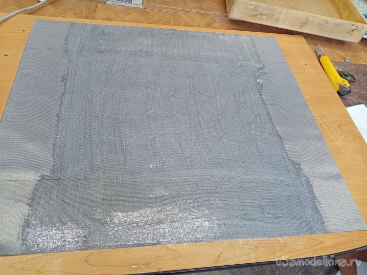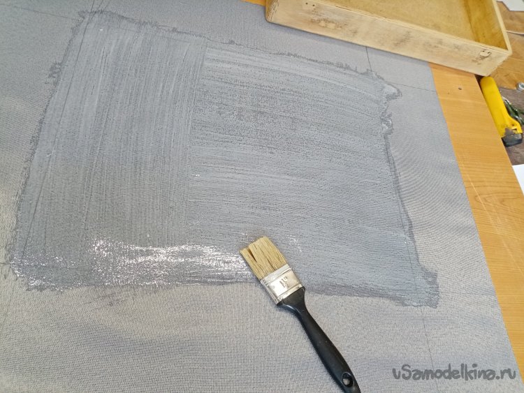 Опыты проведены, начинаю готовить все для оклейки. Развожу ПВА до консистенции кефира примерно и полностью промазываю весь ящик в тех местах, где буду приклеивать обшивку. И получается не только с внешней стороны, но и внутренние борта тоже нужно обшить заодно, не разрезая материала. Коробочка подсушивается на батарее. Кисточку опять опускаю в воду. Чтобы не засохла. Перед дальнейшим использованием, просто отожму воду, чтобы дополнительно не разбавлять клей.