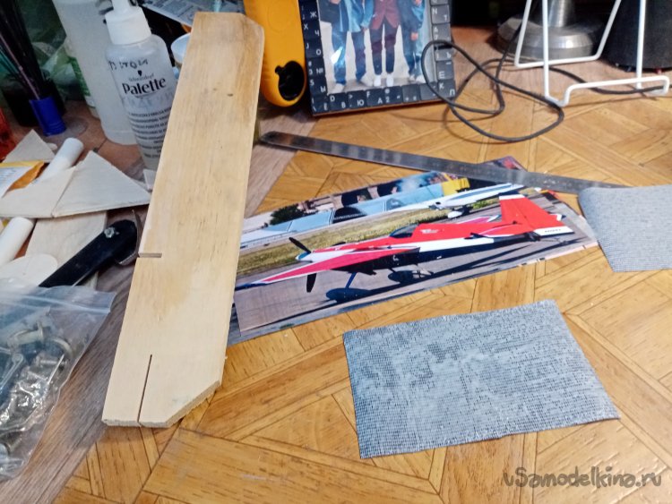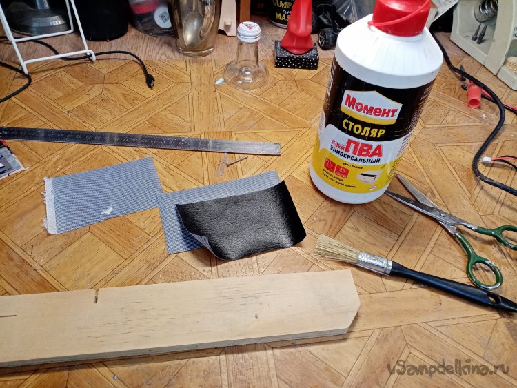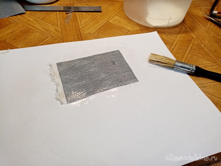 Нужно провести несколько опытов по варианту наклейки этого материала. Приготовил несколько обрезков, клей, кисточку и брусок.