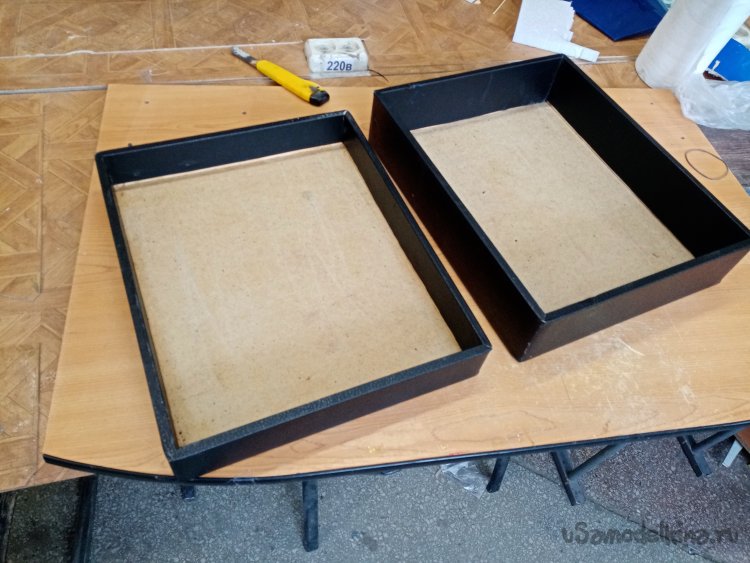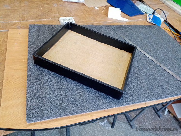 Первый вариант компоновки внутреннего пространства. Вставки для хранения парочки пультов. В качестве шаблона для выкройки использую упаковку. В ней переслали пульт. И внутренние ниши точно соответствуют его габаритам.