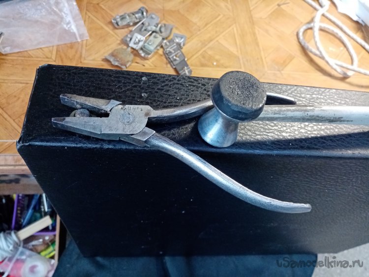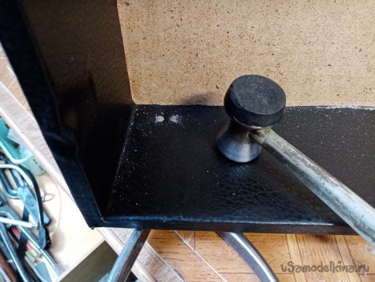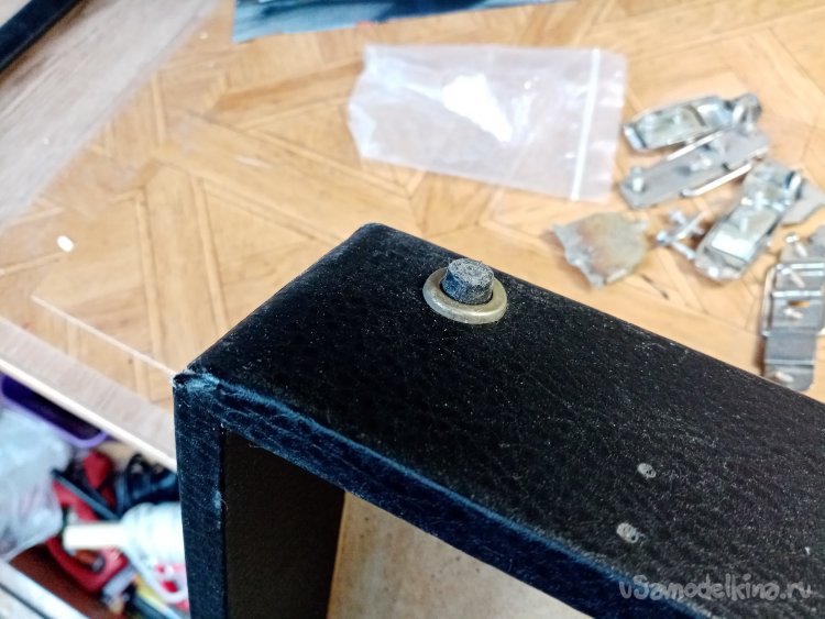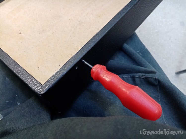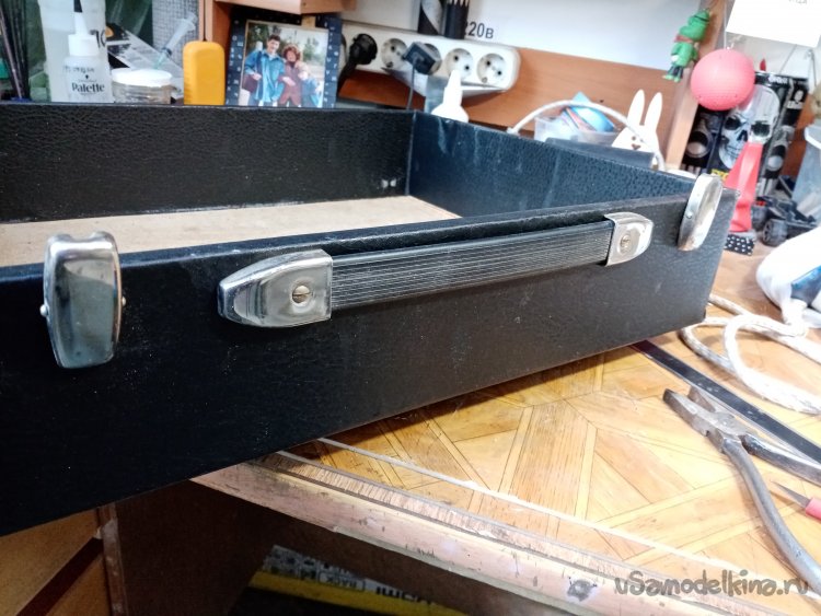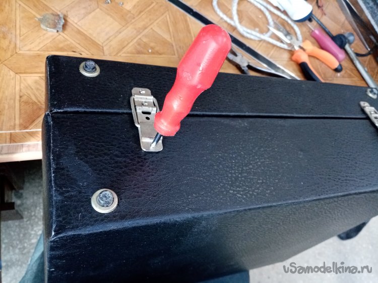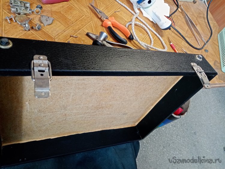 Нужно собирать чемоданчик. Но вот незадача некоторые элементы крепления, вернее, отверстия под их установку я в пылу заклеил. И нет никакой возможности определить места. Пришлось немного снять обшивку с внутренней стенки. Прогрев горячим утюгом и осторожно отклеил. Получил доступ к отверстиям. Проколол насквозь при помощи шила.