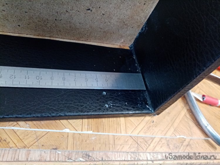 Сейчас есть возможность на внешней стороне просмотреть места установки ножек. Затем обратно приклеиваю кусочек обшивки. Вернее привариваю клей утюгом.