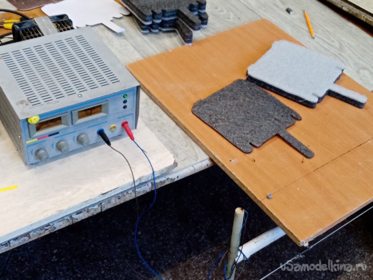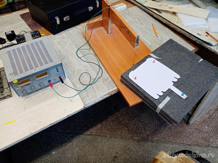 Закрепляю шаблон на поролоне при помощи иголок и на ненужном кусочке подбираю накал струны.