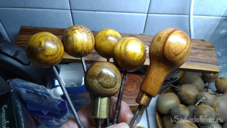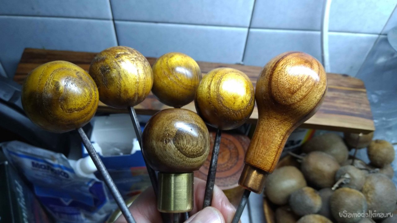 Но вернёмся к рукояткам, я пробовал всякие, и без ручки тоже. Пока не определился какие именно наиболее удобные. На мой взгляд по ощущениям с обычными деревянными шариками диаметром 28-32 мм. Иногда удобнее рукоятку в виде карандаша, диаметром не более 10 мм.