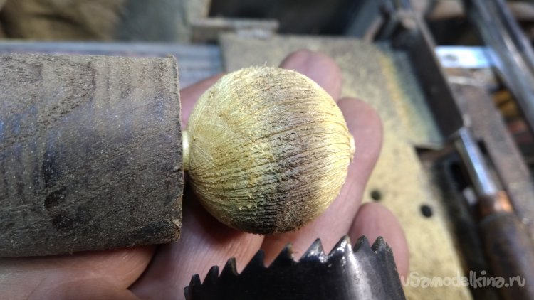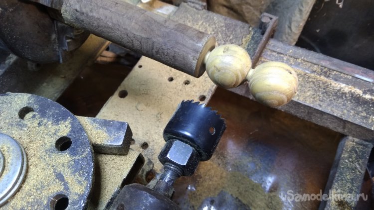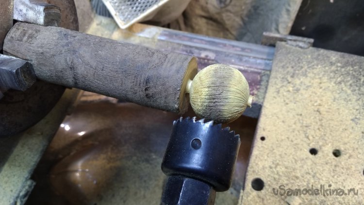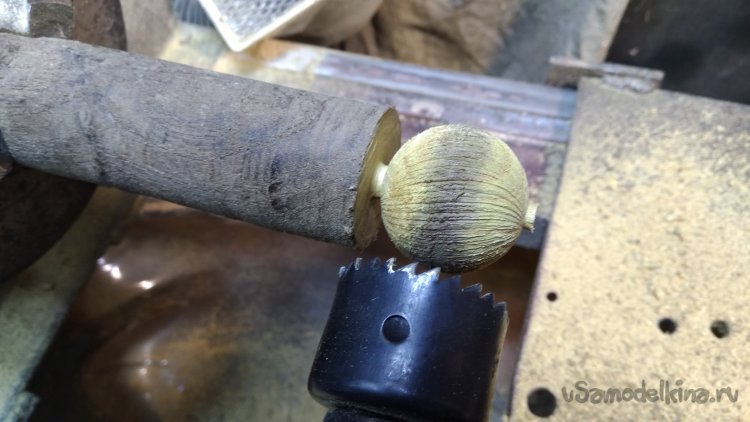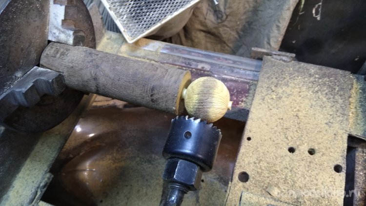 При наличии токарного станка такие шарики делаются очень просто при помощи приспособления. Я закрепил дрель в суппорт станка, перпендикулярно оси вращения патрона. В дрель зажимаю коронку по дереву с извлечённым направляющим сверлом, включаю привод патрона и дрель, при одновременном вращении подвожу суппорт с зажатым в резцедержателе приспособлением с дрелью к заготовке. Шарик протачивается по диаметру равному внутреннему диаметру коронки.