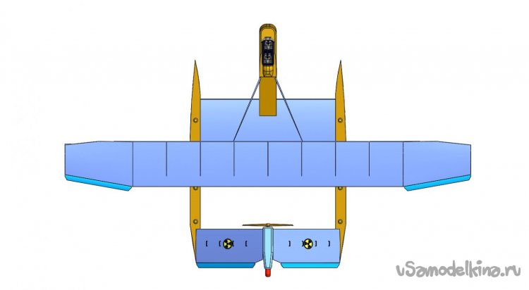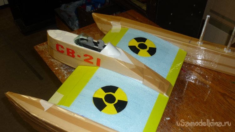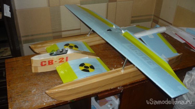 Склеил два слоя наклонных килей, смонтировал на них основание для силовой установки и вклеил их в поплавки.