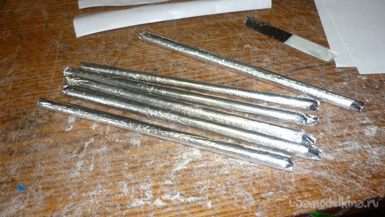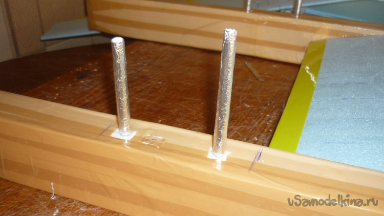 Из бумаги А4 скрутил стойки под крылья, обтянул самоклеящейся алюминиевой фольгой.