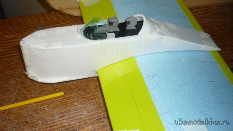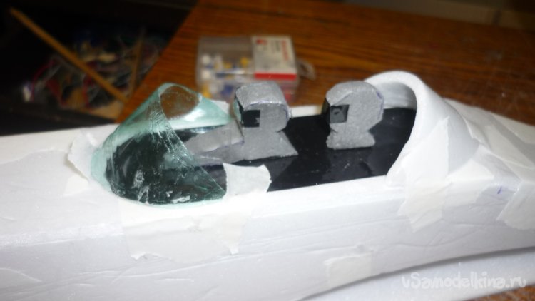 Обозначил кабину, вклеил лобовое стекло и спинку. Вырезал фигурки пилотов, посадил в кабину.