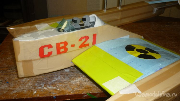 На основное , переднее крыло нанёс надписи и символы радиационной опасности. Смонтировал фюзеляж на крыло.