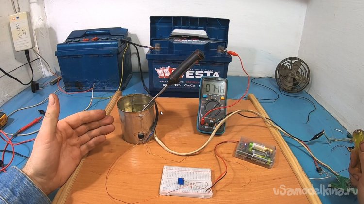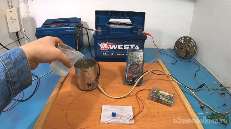 Налил в консервную банку воды, источником питания выступил автомобильный аккумулятор.