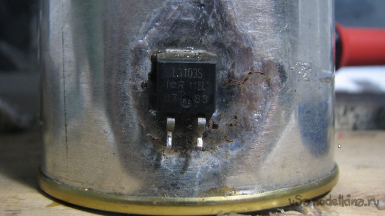 В первом опыте я решил припаять транзистор к консервной банке. Для лучшего теплоотвода сделал на банке вмятину и налил припоя. Потом все прогрел строительным феном и плюхнул туда транзистор. Вот и все, транзистор у нас установлен на хорошем теплоотводе.