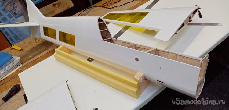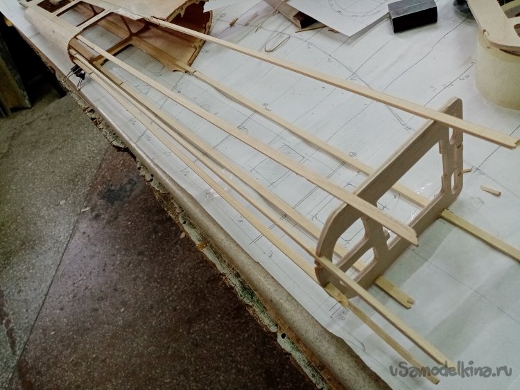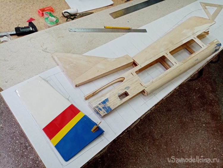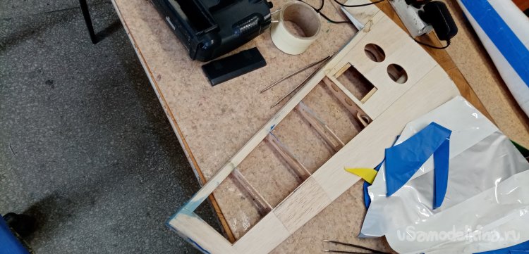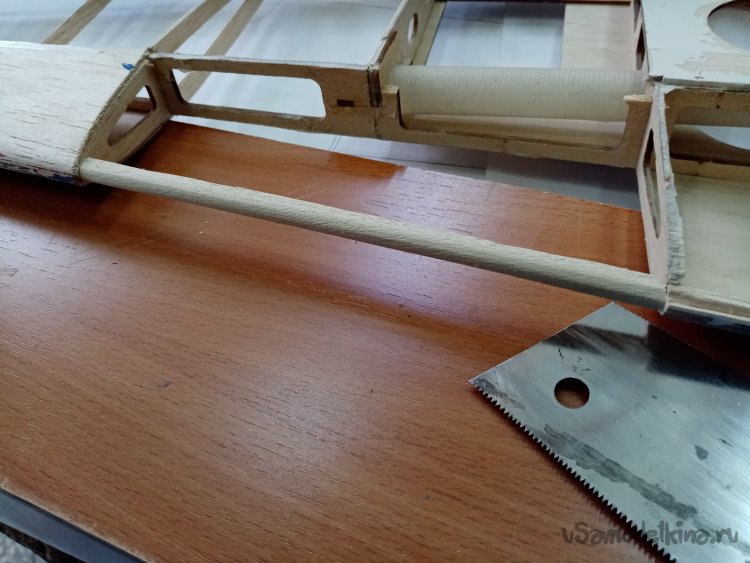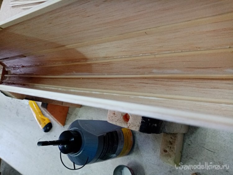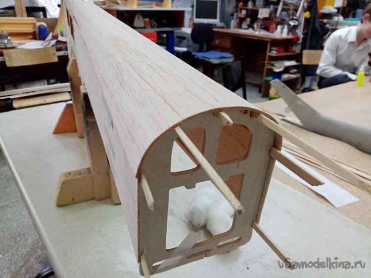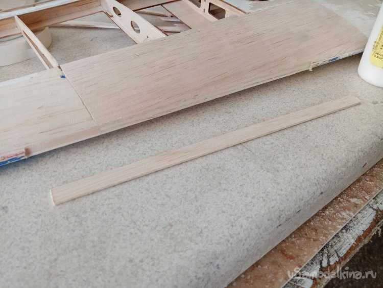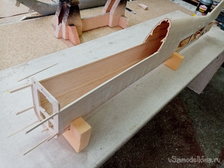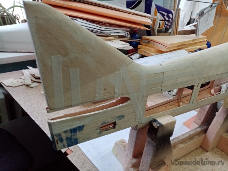 Из 2мм бальзы склеил встык полоску на вертикальные стенки фюзеляжа.