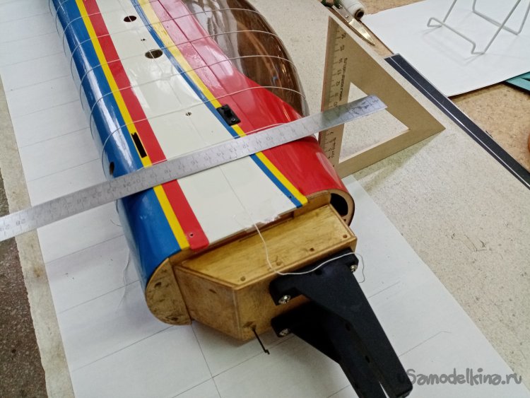 В представленном фюзеляже установлена другая моторама под калильный двигатель. Значит придется самому изобретать. Приемы копирования достаточно простые. При помощи угольников и линеек. Установка измерительных инструментов хорошо видна на фото. Разбил носовую часть фюзеляжа на равные отрезки при помощи ниток. И копирование началось.