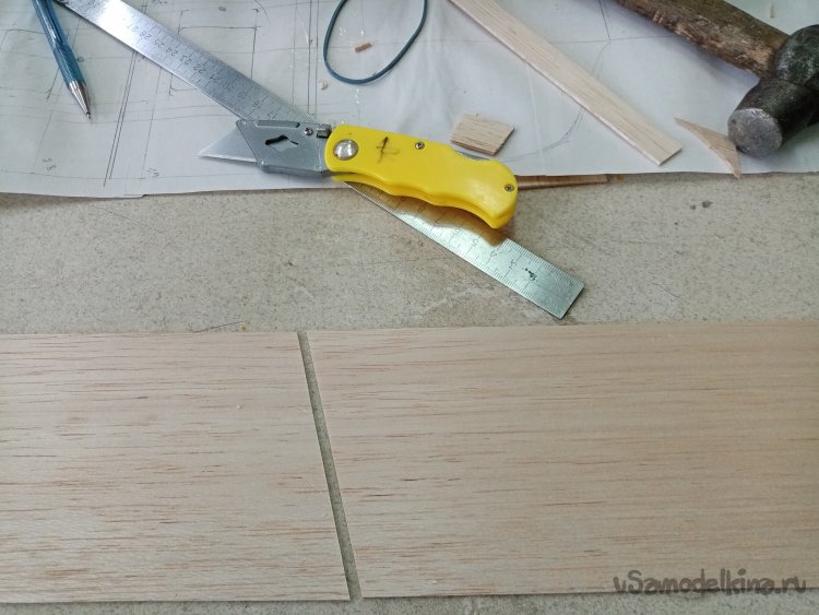 С целого элерона снимаю размеры, на полоске бумаги вычерчиваю. Закрепляю на отрезке мебельного щита в 16 мм и сверху оклеиваю прозрачным скотчем, для защиты от клея. Собираю каркас из реек и полосок бальзы.