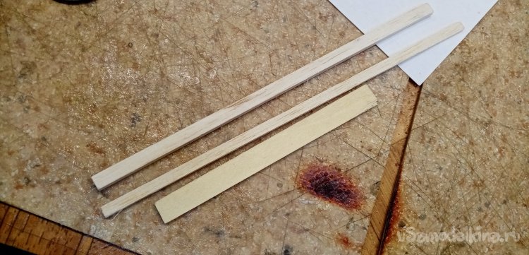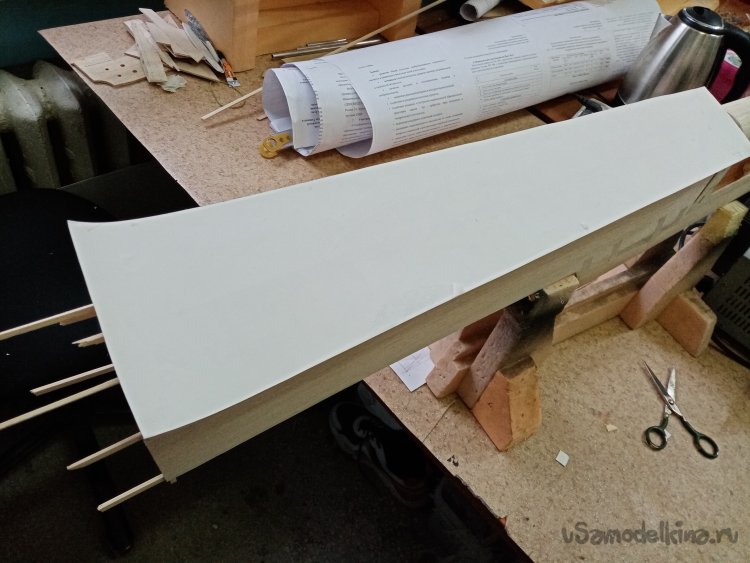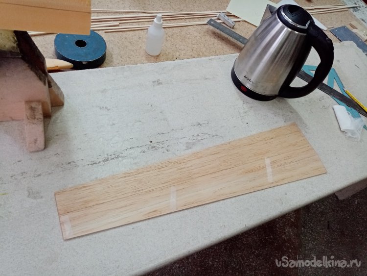 Склеенную полосу из 2мм бальзы обильно поливаю горячей водой из чайника.