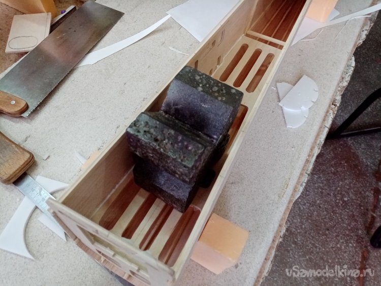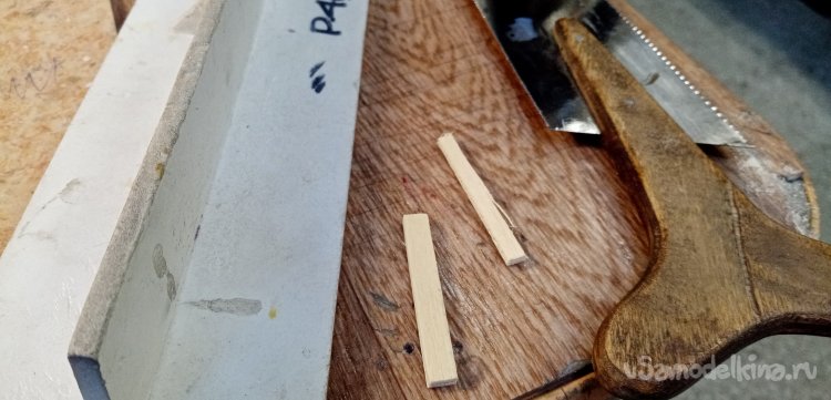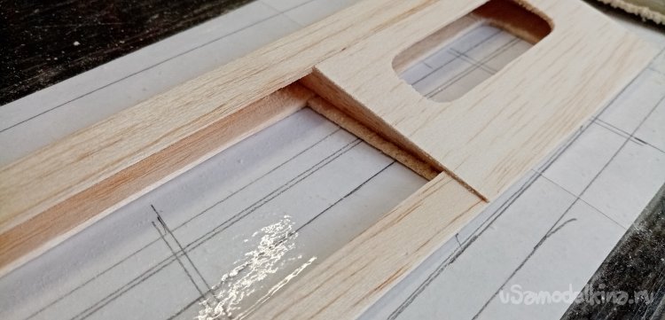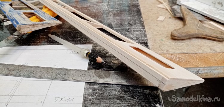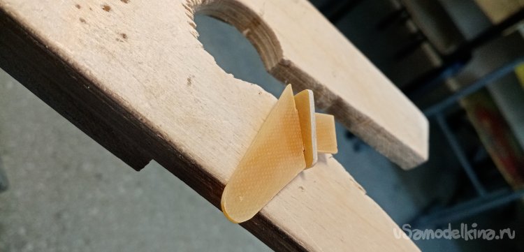 Не доставало пяточки. Приклеил заготовки из 10 мм бальзы на ПВА. После высыхания отработал в размер.