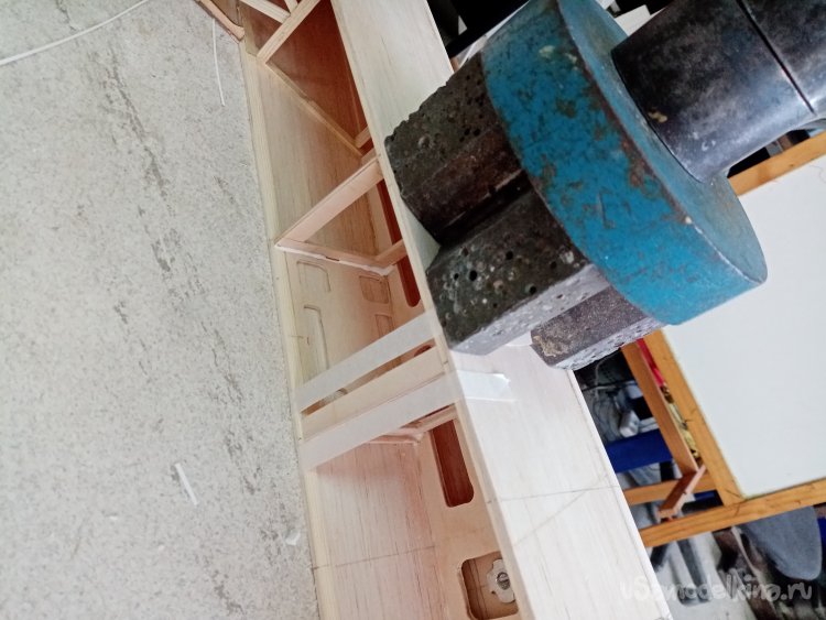 После приклейки реек примерял первую перегородку из фанеры. Приклеилось все ровно без искажений и перекруток формы. Основные размеры сверяю с чертежом. Ровно, можно продолжать.
