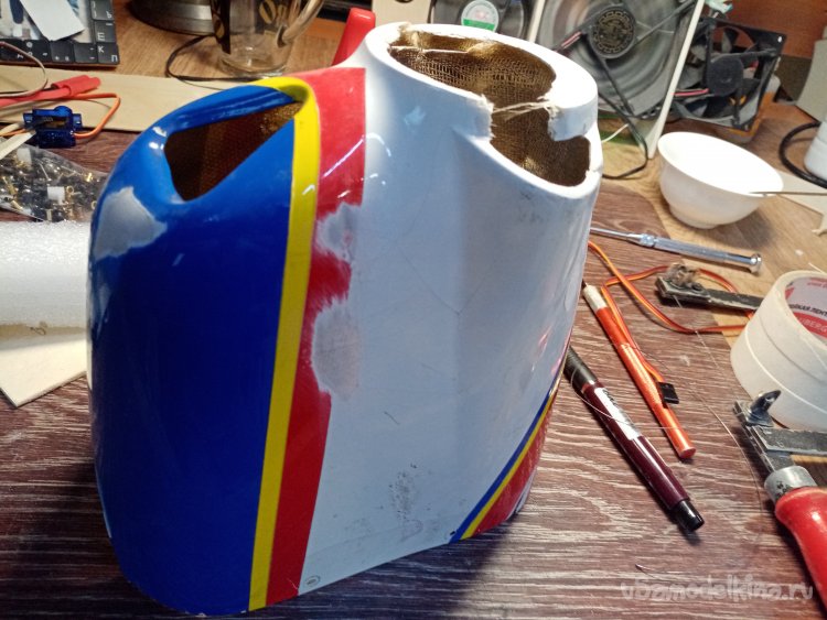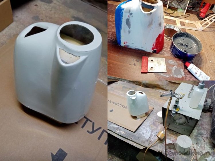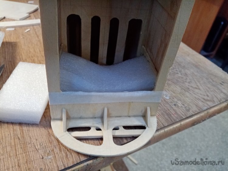 Эта деталь доставила мне много хлопот. Оказалось, она сделана из одной бальзовой болванки. Пришлось очень аккуратно выдолбить внутренность до толщины стенок в 2мм. После долбежно сторгательных работ приклеиваю её на место.