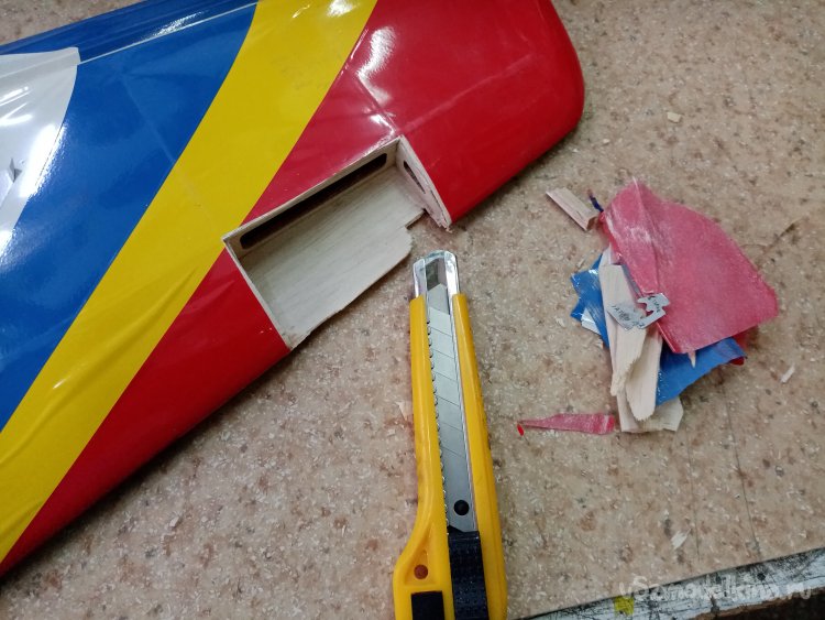 Это крылышко повреждено более серьезно. Снимаю пленку подогревая её феном. Клей размягчается и пленка хорошо снимается. Отверстие в передней кромке крыла подрезаю от осколков. Обшивку удаляю до середины толщины каркаса.