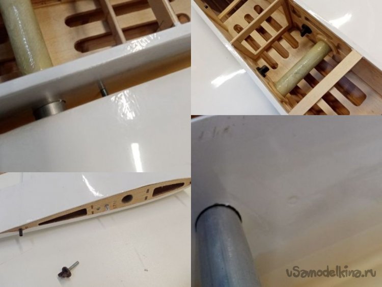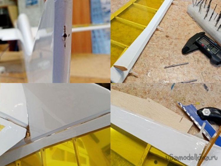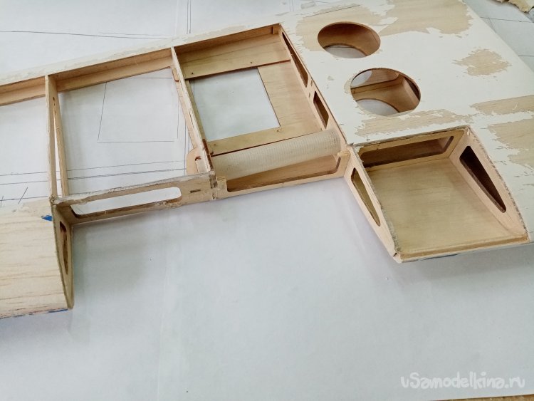 В бортах фюзеляжа прорезаю отверстия для трубы крепления крыльев. Болтов фиксации и отверстия для проводов управления элеронами.