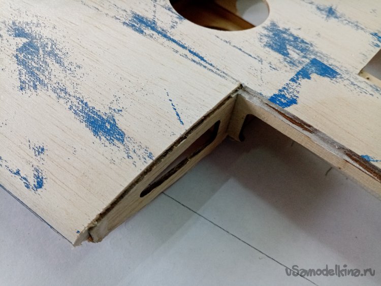И тут еще не достает верхней детали облегченной нервюры. Просто вклеиваю кусочек бальзы. После высыхания обработаю.