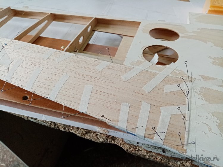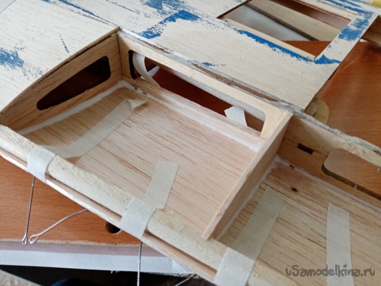 Приклеиваю брусок вместо переднего лонжерона. На него кусочек обшивки из 1.5 мм бальзы. Фиксирую малярным скотчем.