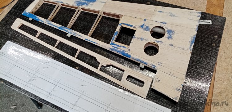 Немного удлинил остатки стрингеров рейками. Приклеил продолжение этих палочек. Соединения изготовил по классике «на ус». Клей использовал ПВА. Дополнительно усилил места соединения при помощи тонких ниток, промазал поверх клеем. Очень тщательно слежу за точностью приклейки палочек удлинения стрингеров. Выпилил из 4 мм фанеры детали на носовую часть. Перегородки площадки и прочее.