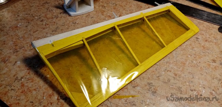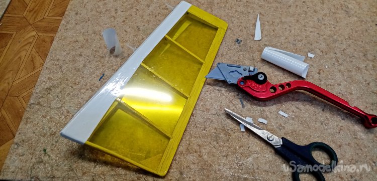 Промазываю каркас руля обувным термореактивным клеем. Дождавшись полного высыхания, приклеиваю при помощи утюга прозрачный лавсан желтого цвета. И затем полоску белой пленки.