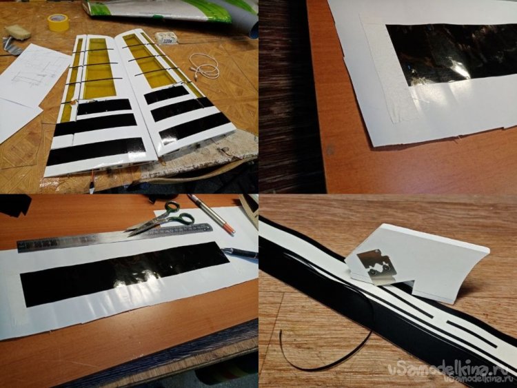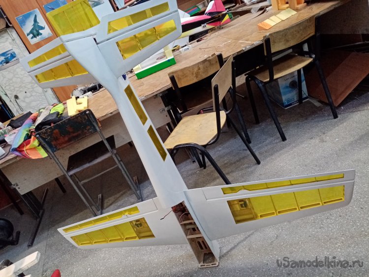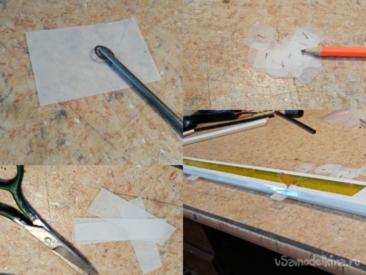 Элероны навешиваю на плоские пластиковые петли. Немного пластика от рассеивающего экрана ноутбука. Немного покатаю по нему колесиком для лучшего сцепления. Режу на квадратики и вклеиваю петли на циакрин.