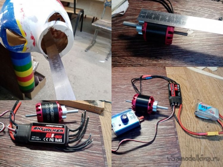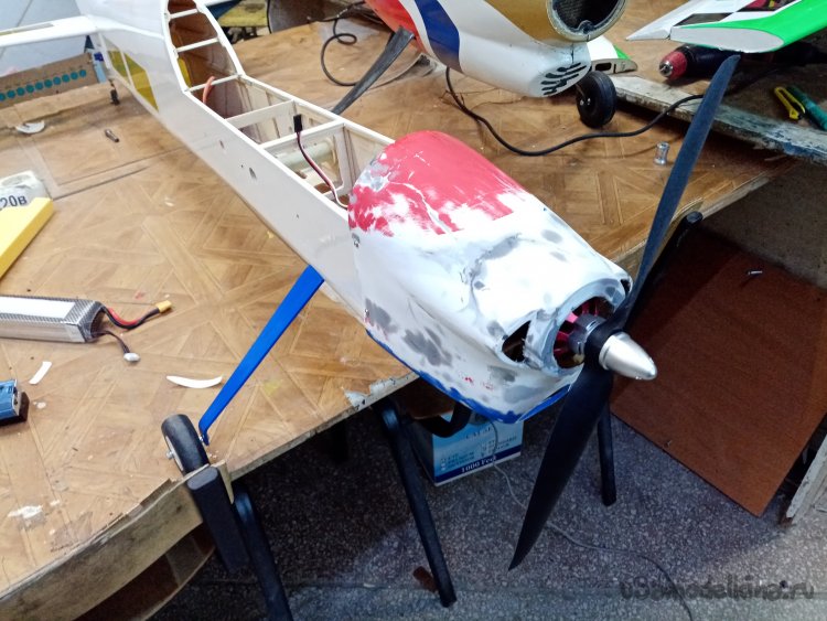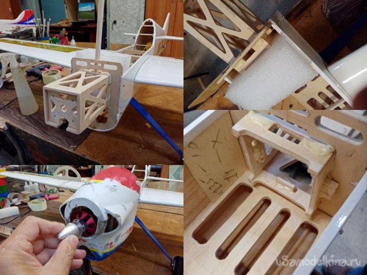 Вклеиваю мотораму в передний шпангоут на эпоксидке. Примерял двигатель и капот.