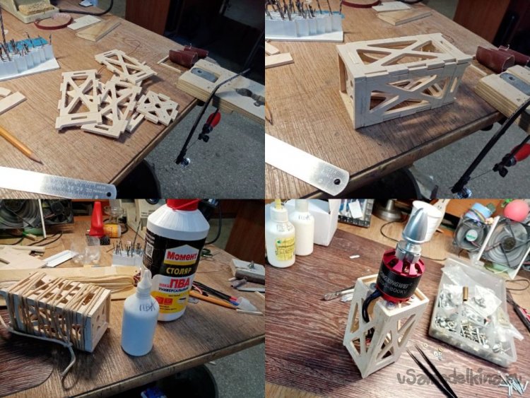 Выпиливаю башенку моторамы из 4мм фанеры. Склеиваю на ПВА. Заранее сверлю отверстия под мотораму двигателя.
