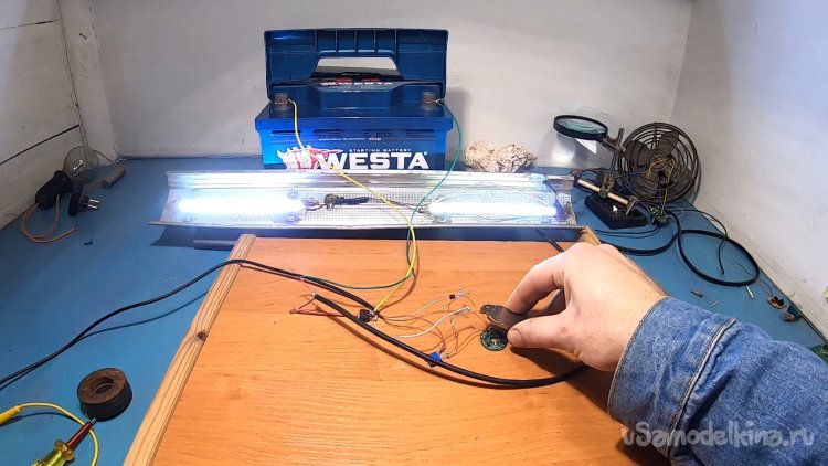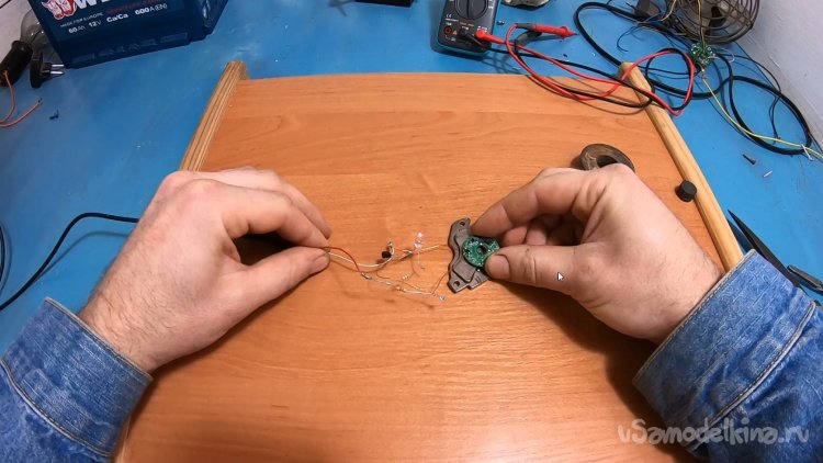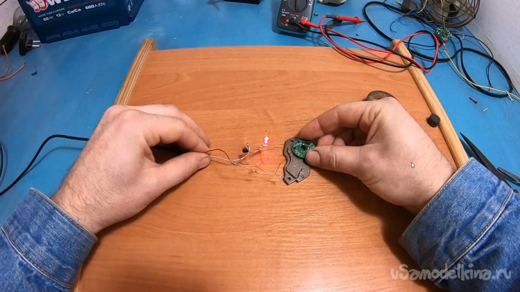 Ну а теперь усилим сигнал еще больше, подключив мощный полевой транзистор. На схеме видно, что мосфет подключается вместо светодиода, в качестве нагрузки используется светодиодная лента, а источник питания – автомобильный аккумулятор.