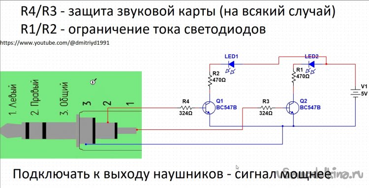Первым делом изучим схему, она очень простая. Мы видим два транзистора, базы которых подключены к выходу мини-джека 3.5 мм, сюда при включении звука поступает сигнал, и транзисторы открываются.