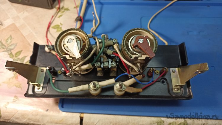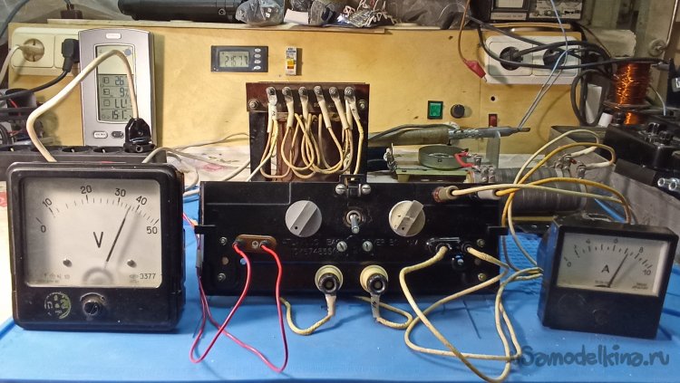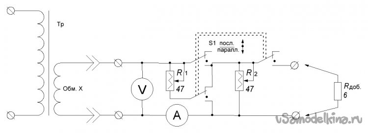 Потенциометры – проволочные, по 47 Ом 50 W, тумблер – тройной 20-амперный со средней точкой (разрыв всех цепей, остаётся включённым только вольтметр). Добавочная нагрузка (использую открытый проволочный элемент 2х3 Ом) – ну, это для проверки сильноточных обмоток, ампер на 10 ~ 20. В этом случае R1 и R2 используются для плавной подстройки тока. Осторожно! Не закоротите вторичную обмотку "нулями" потенциометров!!!