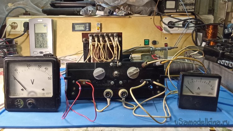 Стенд в работе. Сзади справа шунт 6 Ом. Тумблер в режиме "Параллельное подключение. Приборы - электромагнитные.