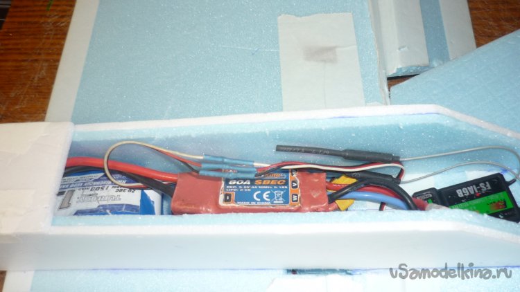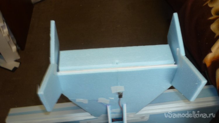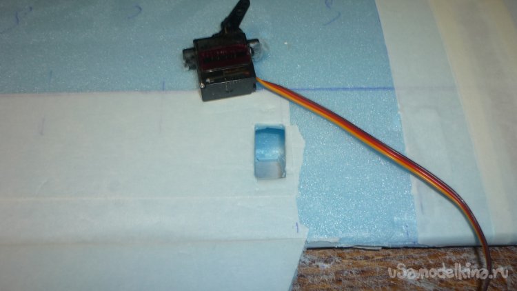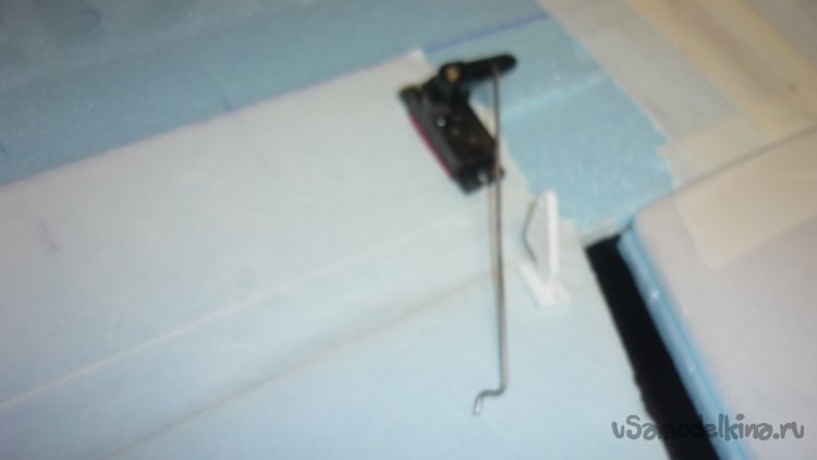 Размечаю место установки сервомашинки для руля высоты. Сервомашинку обтягиваю двухсторонним скотчем, вставляю на заготовленное место и фиксирую клеем. Вклеиваю, кабанчик на руль высоты, подсоединяю тягу.