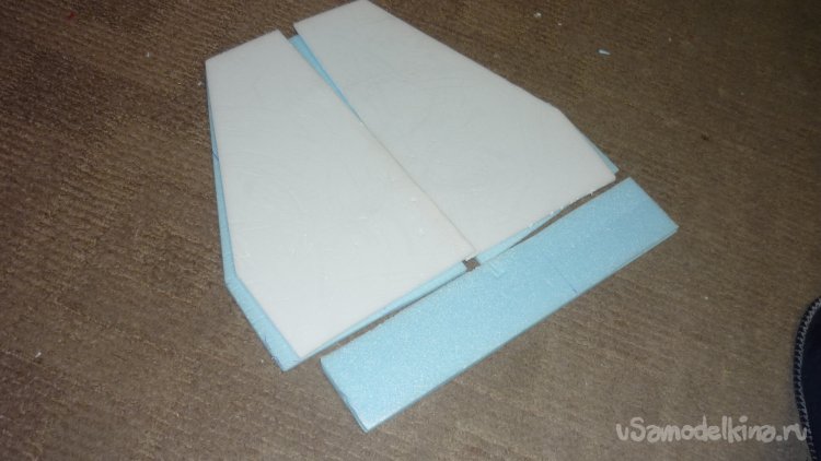 Из подложки вырезал две заготовки для руля высоты, склеил и срезал переднюю кромку под 45