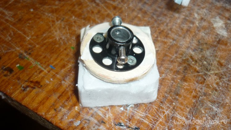 Выпиливаю из 3 мм. фанеры кружочек диаметром 40 мм и вклеиваю на кусок пенопласта.
