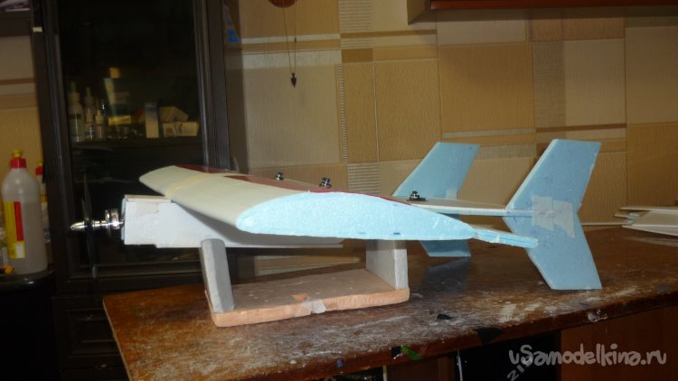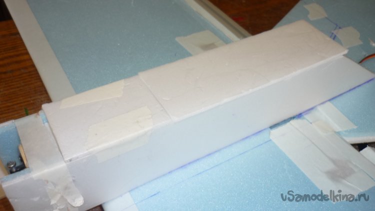 В носовую часть фюзеляжа вклеиваю кусочек белого пенопласта, отрезанный от упаковки водонагревателя.