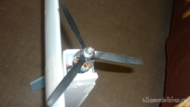 Хочу попробовать два варианта моторов. Всё дело в том, что модель должна взлетать вертикально, стоя на своих килях, а потом переходить в горизонтальный полёт. Надо подбирать мощность мотора и соответствующий винт.