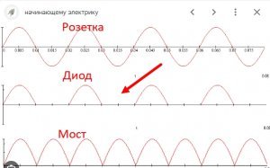 Если мы возьмем диод и обрежем половину амплитуды, от этого мы не уменьшим напряжение, но мы вдвое уменьшим силу тока, потому что вместо отрицательной полуволны у нас будет «0». Таким образом, не меняя частоту, получается, меняется разделить импульсы промежутком, типа как в контроллерах ШИМ.