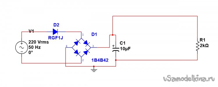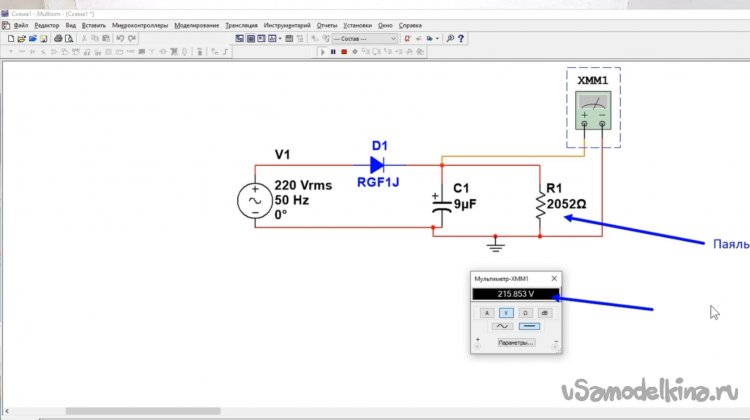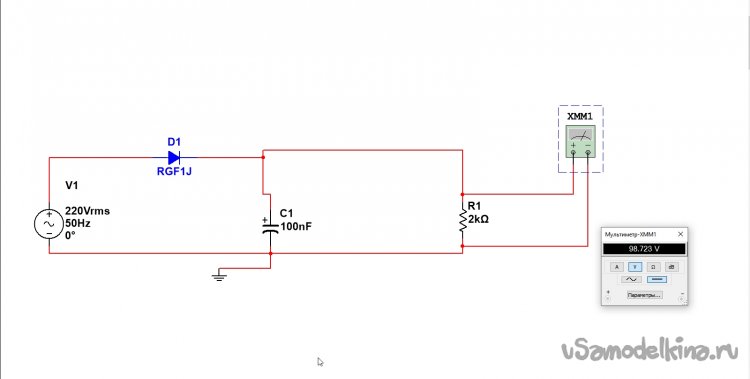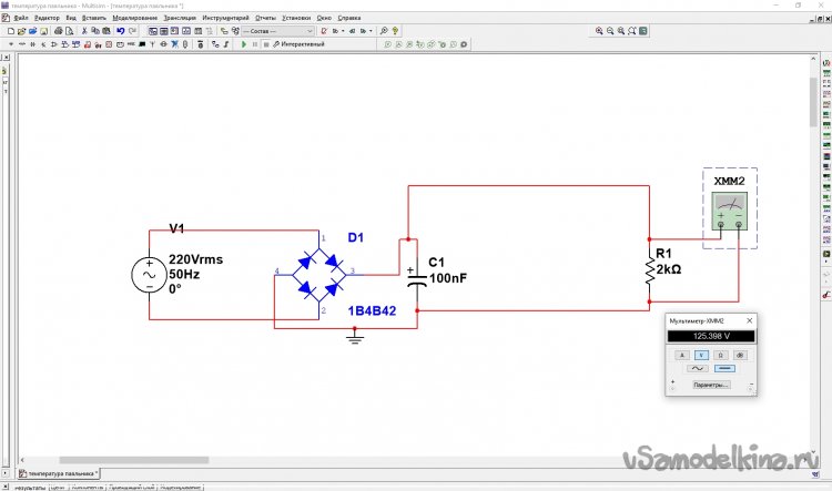 Для проведения первичных опытов можно использовать программу симуляции NI Multisim. В качестве опыта ставим конденсатор 100nF и при резисторе 2кОм получаем напряжение на нагрузке 125В.