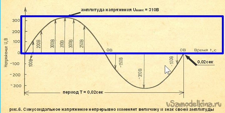 В первую очередь разберем, как все работает. У нас есть переменный ток, это «положительная» и «отрицательная» амплитуда напряжения относительно нуля, а на пике этой амплитуде напряжение 310В.