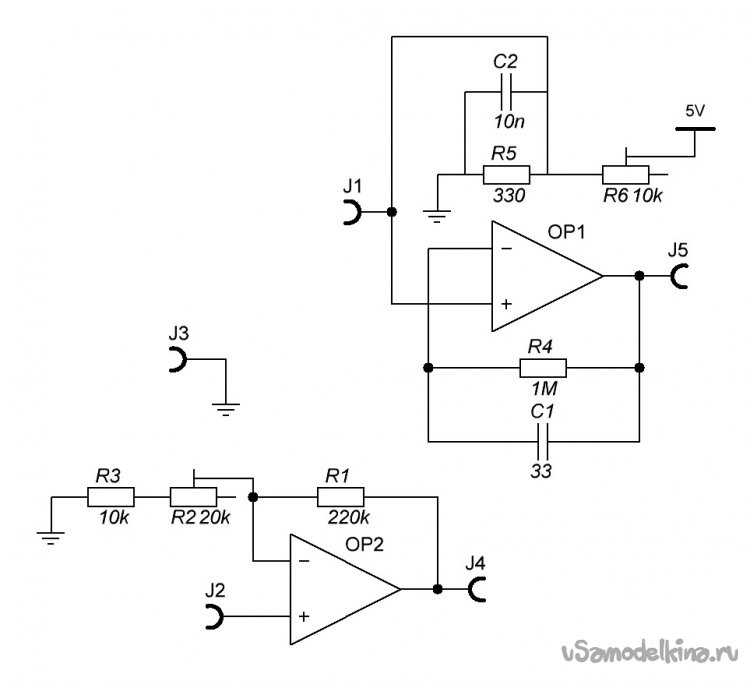 Первый блок состоит на основе элемента ОУ ОР1, элементы как резистор R4 на 1МОм и керамический конденсатор C1 на 33пФ отвечают за дискриминацию сигнала этого блока, включены к инвертирующему входу и выходу операционного усилителя. Конденсатор C2 на 10нФ предназначен заглушить различные помехи в частности тепловые. Также есть регулировка смещение напряжение для дискриминации, которое подключено к не инвертирующему входу операционного усилителя, создано на основе резистора R5 на 330Ом и подстроечного резистора R6 на 10кОм которые из себя представляют делитель напряжение подключен к источнику 5В.