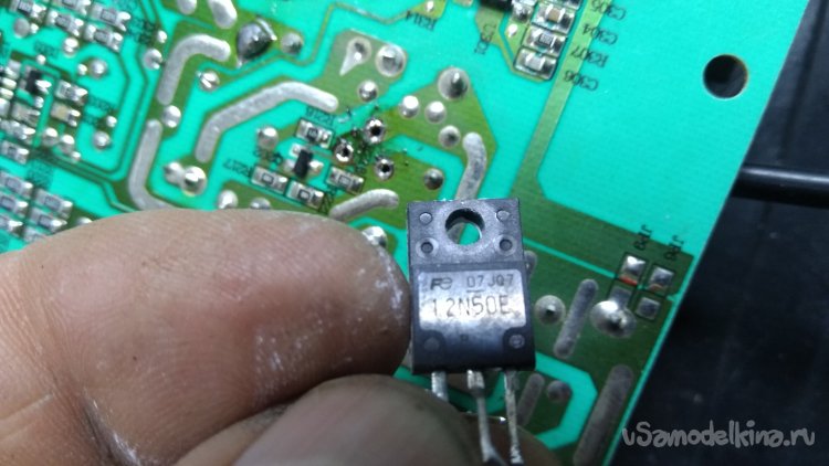 У меня, к сожалению, ещё и транзистор пробило, конденсатор сглаживающий выпрямленное сетевое напряжение внутри оборван, в таком режиме даже транзистор на 500 вольт и 12 ампер не выдержал.