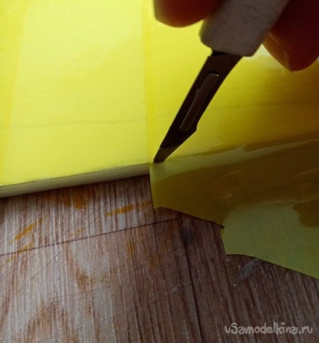 Небольшой нюанс. При отрезании полоски скотча ножом протыкаю его рядом с краем. Таким образом, добиваюсь стабильного и четкого реза кромки без загибов.