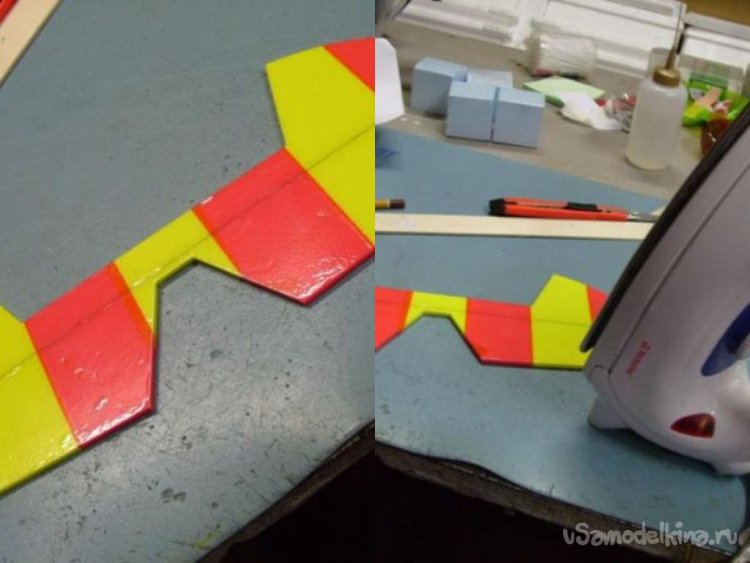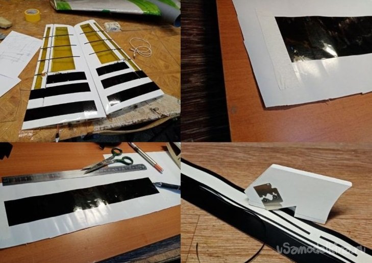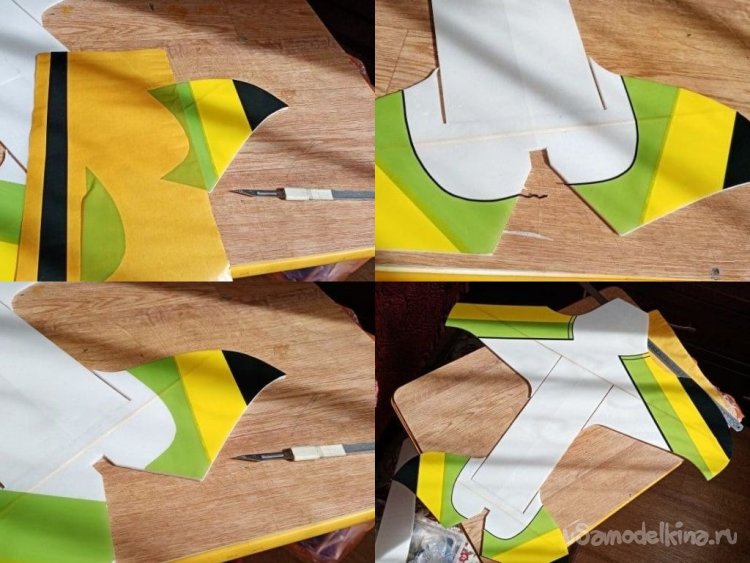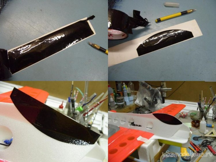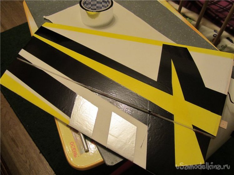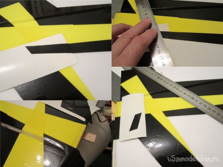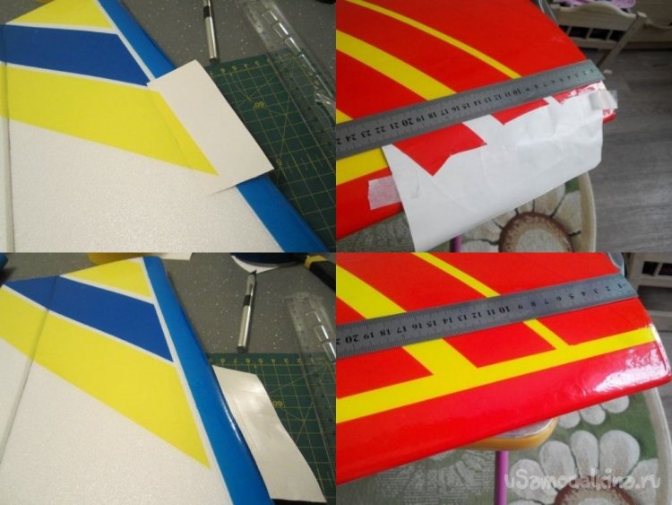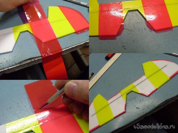 Следующий прием. Отрезаю полоски прямо на самолетике. С некоторого времени наклеиваю простые полоски на крылья и фюзеляж не сплошняком, а с некоторым расстоянием. Отрезать заранее кончик полоски под нужным углом не всегда представляется возможным. Поэтому на стыки полосок заранее укрепляю кусочек подложки и приклеиваю скотч с запасом на нее. Нужный угол фиксирую при помощи металлической линейки и осторожно отрезаю скотч. Кончик ножа упирается в подложку и не повреждает ниже лежащий скотч и пенопласт крыла. Затем отделяю бумажку вместе с ненужными отрезками, приклеиваю кончики. При определенном навыке начинаешь чествовать, когда кончик ножа упирается в пластик подложки. И нет риска прорезать весь бутерброд навылет. Небольшой образец раздельного нанесения полос.