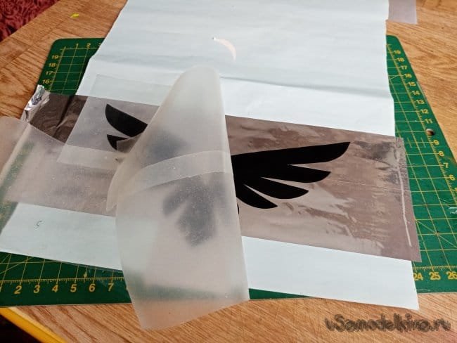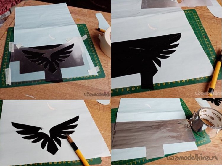 Еще одна более сложная комбинация рисунка из сужающихся полосок. Предварительно прорезаю наклеенные полоски на треугольник и затем предношу на крыло. Осторожно приподнимаю кончик и приклеиваю на нее подложку. По линейке отрезаю нужные размеры, приклеиваю на место.