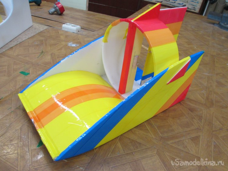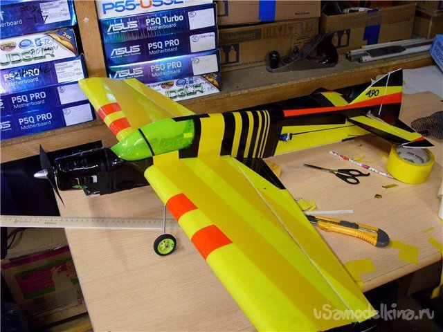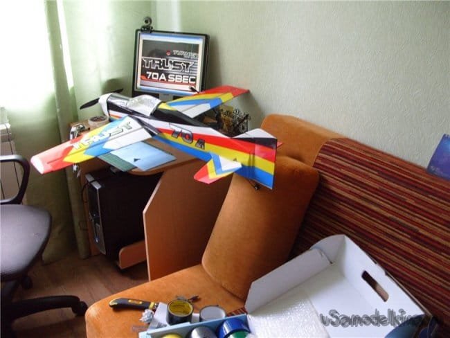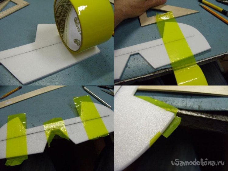 Очередную пилотажную модель из пенопласта назвал по имени регулятора. Давно пользуюсь такими, очень хороший продукт, однако. Как видите для работы со скотчем вполне достаточно дивана и столика. Чисто и быстро.